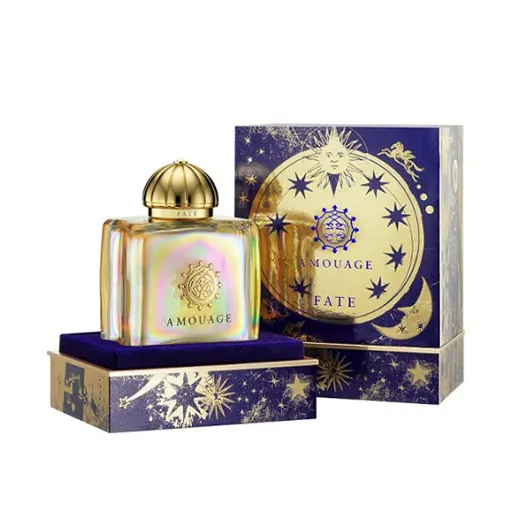 عطر آمواج فیت زنانه Amouage Fate woman ، محصولی لوکس و ممتازی است که در بطری بسیار شیک و مروارید رنگی که توسط سایه روشن هایی از زرد ، بنفش ، سبز روشن و آبی روشن طراحی شده ، قرار دارد. جزئیات طلایی آن زیر سایه ای از ترکیب جادویی آن پنهان شده . این داستان افسانه ای سمبلی از ماه، خورشید و ستاره های آسمان می باشد .